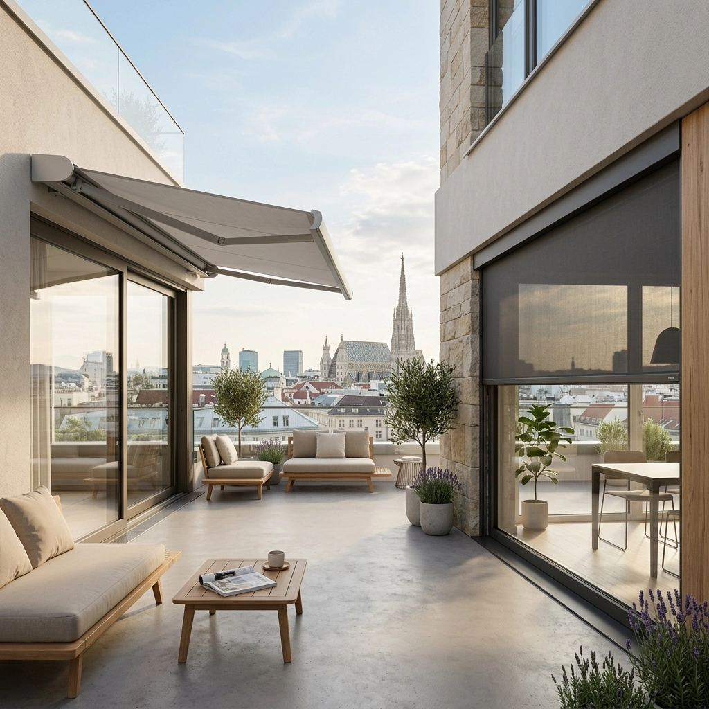 In modernen Wiener Immobilien sehen wir immer häufiger eine Kombination. An der Südseite des Hauses werden Zip Screens für die Fenster genutzt, um das Aufheizen der Räume zu verhindern. Gleichzeitig wird über der Terrasse eine großzügige Markise installiert.
